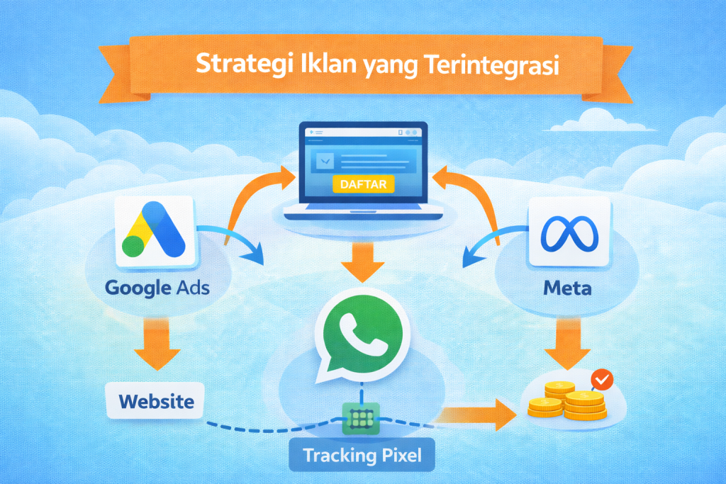 Gambar 2. Strategi iklan terintegrasi menghubungkan Google Ads, Meta Ads, website, dan WhatsApp untuk menciptakan alur konversi yang terukur dan maksimal.