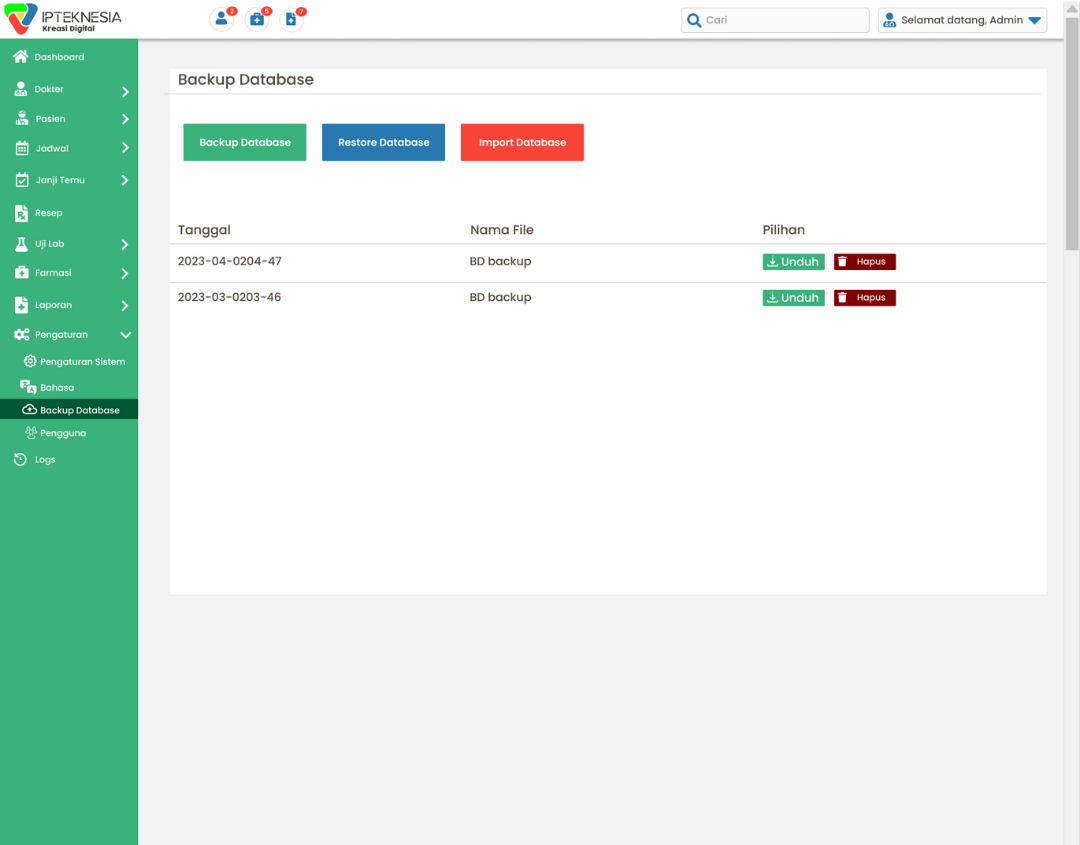 Fitur Backup & Restore Database adalah proses krusial untuk menyalin seluruh data secara berkala (Backup) guna memastikan data tersebut dapat dikembalikan ke kondisi normal terakhir (Restore) saat terjadi kehilangan, kerusakan sistem, atau serangan siber.