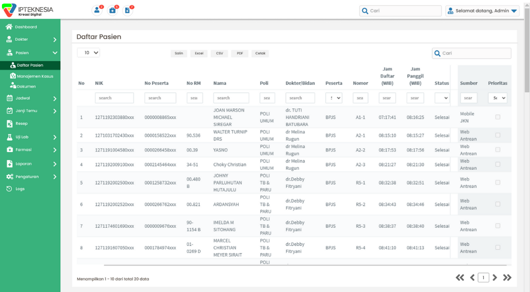 Daftar pasien, pembayaran, manajemen kasus, dokumen pasien