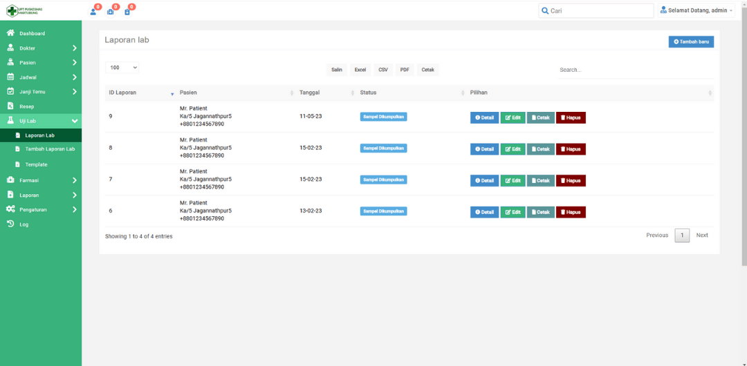 Menampilkan ringkasan dari masing-masing fitur seperti jumlah dokter, pasien, janji temu, riwayat kasus, uji lab, laporan, dan jadwal pasien