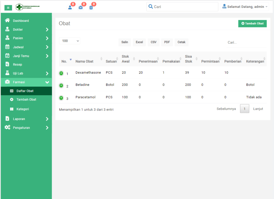 Daftar obat, tambah obat, pengelolaan stok obat (aktif, kadaluarsa, rusak)